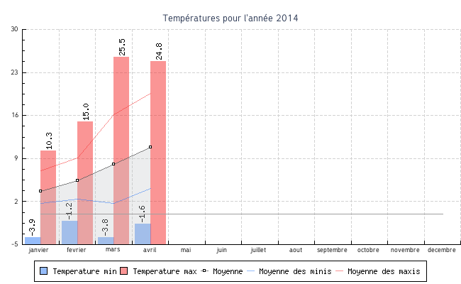 | avril | -1.6 °C | 4.1 °C | 24.8 °C | 19.6 °C | 10.8 °C | 2.6 km/h | 26.3 km/h | S |